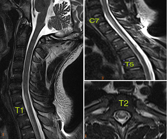 Figure 1 Sagittal T2-weighted sequence of the spine with signal alteration in the anterior third of the spinal cord. 2. axial T2-weighted sequence observes signal alteration in the anterior third of the spinal cord with predominance of grey matter involvement. With predominance of involvement in the gray matter. 3. extension of the alteration in the anterior third of the spinal cord (C7-T5).