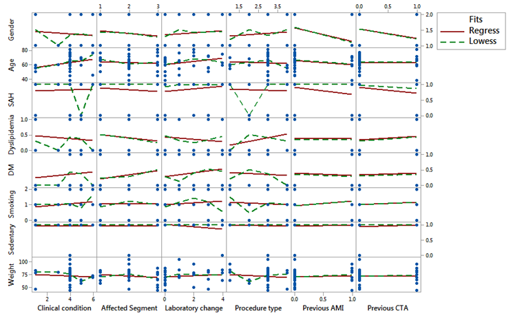 Results: the result of the statistical correlation of regression between the continuous predictors and the response was demonstrated by means of the Matrix-Plot model graph. All analyzes presented statistical difference with p > 0.05, except between the predictors segment affected x DM, laboratory abnormality x gender, laboratory abnormality x sedentary lifestyle, previous AMI x gender and previous ATC x gender. All the latter presented statistical significance, with p<0.05.