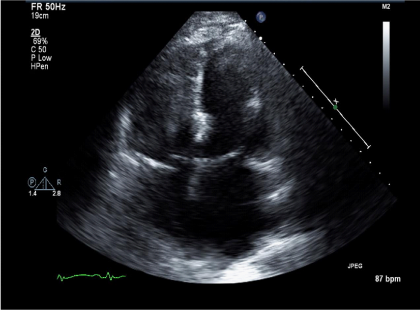 Figure 3 Echo- at Presentation. Apical-4 chamber view showing a dilated left and right ventricle despite increasing the lvad rpm.