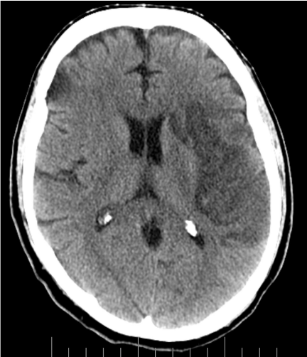 Figure 2 CT- Head at Presentation. Large left non- hemorrhagic middle cerebral artery infarct with mild mass effect.