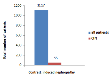 Results: Among 1117 patients, the incidence of CIN was (4.9%) and this represents 55patients. Out of those 55 patients, 35 (64%) patients were diabetic, 39 (71%) patients were hypertensive, 38 (56%) patients under went diagnostic cardiac catheterization, 17 (34%) had PCI, 23 (41%) patients had body weight <70 kg, and 44 (80%) patients received omnipauqe contrast media.