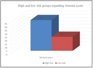 This prospective study included 100 non diabetic patients who referred for doing coronary angiography within three months of acute coronary syndrome (unstable angina, Non ST segment elevation MI or ST segment elevation MI). Diabetic patients or non diabetic patients with fasting blood sugar > 126mg/dl or HbA1c more than 6.5% were excluded from the study. Included patients were subjected to complete medical history taking and physical examination with special emphasis on history of other risk factors as hypertension, smoking or family history of CAD. For all patients; 12 lead ECG, cardiac enzymes (troponin T and CK-MB), fasting blood sugar, HbA1c, lipid profile and serum creatinine. Transthoracic echocardiogram study was performed after admission to identify the estimated ejection fraction (EF), regional wall motion abnormalities and associated valvular lesions. Regional wall motion score index (RWMSI) was calculated as the sum of wall motion scores divide by the number of the segments (normal=1, hypokinesis=2, akinesis=3, dyskinesis=4, and aneurysm=5). American Society of Echocardiography guidelines and recommendations were applied [8]. Coronary angiography was performed using femoral or radial approaches. The severity of CAD was assessed by using the Gensini score [7]. It is a scoring system which allocates a numerical value for the degree of stenosis in a coronary artery and a multiplication factor that depends on which coronary artery is involved and where the stenosis is located in the coronary artery (Table 1).