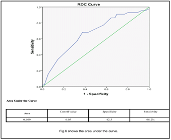 Among total number of 120 screened patients as non diabetics, 12 patients were excluded as fasting blood sugar > 126mg/dl or HbA1c more than 6.5%, 8 patients were excluded because no evidence of CAD. Among 100 patients included, male gender pre dominated (83%). Most of patients were overweight with mean BMI = 29.7±4.9.The most common cause of performing coronary angiography was unstable angina (45%). The Gensini score ranged from (1 to 168) with a mean of 38.3±34.9. Seventy four patients were in high risk group with (HbA1c 5.7 – 6.4%) while only 26 patients were in low risk group with (HbA1c <5.7%). Other data of both groups were comparable (Table 1). Gensini score was found to be significantly higher in the high risk group (Figure 1). Using Pearson’s correlation coefficients, the level of HbA1c was strongly correlated with Gensini score (r=0.35, P<0.05) while HbA1c was weakly correlated with either RWMSI (r= -0.09, p>05) or LVEF (r= -0.04, p>0.05) (Table 2 & Figure 2). The sensitivity of HbA1c in predicting severe coronary atherosclerosis (Gensini >30) was 68.2% while the specificity was 62.5% with a cut-off value of 6.05% (Figure 3).