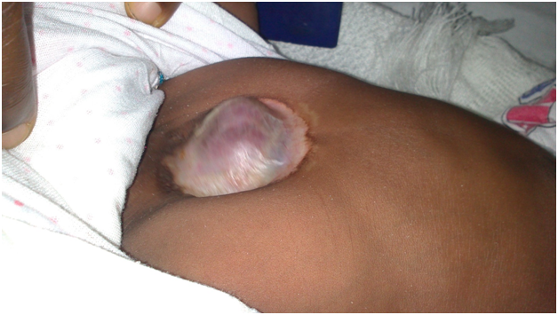 She kept a regular follow up visits where the wound was dressed. There was complete epithelialization of the wound and a thick covering completely covered the pericardium. Two months later, the mesh was completely extruded. The plan was for a reconstruction surgery for apposition of the skin. She was readmitted five weeks after her last clinic visit on account of a three days history of fever and one day history of repeated convulsions. On examination at presentation, she was febrile (40.10 C), pale, in respiratory distress, desaturating in room air, acyanosed and anicteric. She was also, tachypneic, tachycardic, and lethargic with a bulging anterior fontanelle. A presumptive diagnosis of septicaemia with meningitis was made and the necessary investigations requested. Intravenous antibiotics were commenced immediately. Unfortunately she succumbed within 12hours of readmission. She was seven months old at her demise