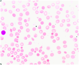 12 lead EKG showed T wave inversion in the lateral leads. Significant laboratory findings included hemoglobin of 10.7 g/dl, platelets of 13000/mm3, lactate dehydrogenase of 1499IU/L and creatinine level of 1.9 mg/dl. Further testing showed elevated D-dimer and Troponin I of 1.09 ng/ml. Transaminases and disseminated intravascular coagulation panel were all normal. A peripheral blood film showed characteristic findings of microangiopathic hemolytic anemia (Figure 1).