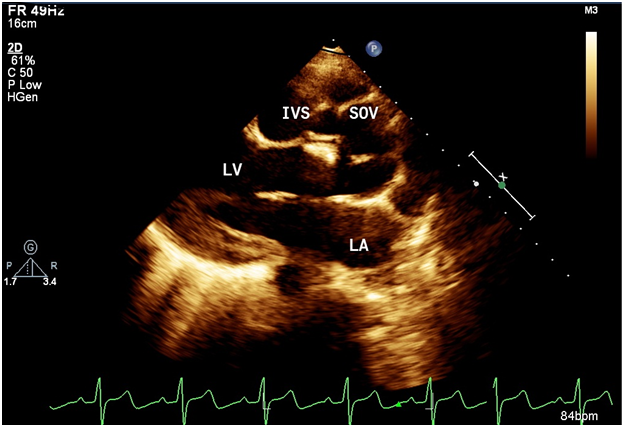 A 24 yrs old pleasant gentleman presented with history of gradually progressive shortness of breath and palpitation on exertion of 5 months duration. He also had history of 2 syncope 6 months prior. On examination he had wide pulse pressure with presence of peripheral aortic run off. Cardiac examination revealed displaced cardiac apex laterally with hyperdynamic apex beat, grade III early diastolic murmur over the aortic area. Rest of the examination was normal. Electrocardiogram revealed LBBB with first degree Atrio-Ventricular block with occasional ventricular premature beats. Chest X-Ray showed prominent bronchovascular markings. 2D echocardiogram revealed aneurysmal dilatation of right sinus of valsalva (SOV) which was burrowing and dissecting into interventricular septum (IVS) – echo free space as shown in Figure 1. LV was dilated with LVEDD of 5.4 cm and LVESD of 4.0 cm and reduced LV function (LVEF 40%). Aortic annulus was dilated (3 cm) and ascending aorta was of normal size. Aortic valve was tricuspid but deformed and calcified with evidence of severe aortic regurgitation. There was no communication of right sinus of Valsalva with any of the chambers. RA and RV were of normal size. TEE revealed same findings as in 2D echo, but both the right and left sinus of valsalva were seen dilated with the right coronary cusp (RCC) seen dissecting into the IVS with a nodular calcification in the vicinity of AoV as shown in Figure 2. Aortogram findings were also compatible with the 2D echo and TEE findings, which showed dilated right SOV without any evidence of leak into any of the chambers. Thereafter patient was taken up for aortic valve replacement along with repair and closure of the right sinus of valsalva aneurysm with Dacron patch. Intraoperatively there was a dilated right SOV with a cavity which led to the dissected IVS. The cavity was filled with calcium deposits and mural clots. The aortic side of the aneurysm was closed with Dacron patch, preserving the conduction system and avoiding the right coronary ostium. Post operative echo after 3 months showed completely healed and thrombosed aneurysmal sac of right SOV within the IVS as shown in Figure 3. There was no LV dilation (5 cms) with normal LV functions with normal functioning of the aortic prosthesis.