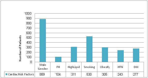 A total of 1061patients who were admitted in King Abdul-Aziz Cardiac in National Guard Hospital from January 2008 to December 2013 with a clinical diagnosis of ischemic heart disease and underwent coronary angiography were studied according to their cardiac risk factors. By using Coronary angiography, obstructive coronary artery disease were found to be in 389 patients (37%); 269 (25%) were S-T Elevation myocardial Infarction (STEMI) and 120 (11%) were Non-STEMI. All patients included in the study are patients aged 45 years and below. The majority of patients were male 889 (83%), while females were 172 (17%). The number of patients who gave a positive family history of coronary artery disease (CAD) were 104 (10%). The number of patients diagnosed with hypertension and taking medication were 243 (23%). Patients with hyperlipidemia were found to be 331 (29%) most of whom were on anti-cholesterol medications. In addition to this finding, 305 (28%) of total patients were defined to have obesity according to their BMI results. Type 2 Diabetes Mellitus were found in 227 (26%) of the studied patients. Of the total number studied, 530 (50%) were known smokers.