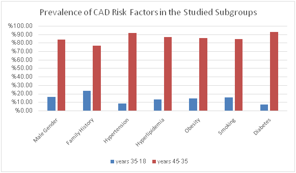 The prevalence of CAD was found the highest in male gender, smoking, and obesity respectively. In patients >35 years we found that HTN and Diabetes were statistically significant risk factors. Therefore, a modification of lifestyle habits is recommended.
