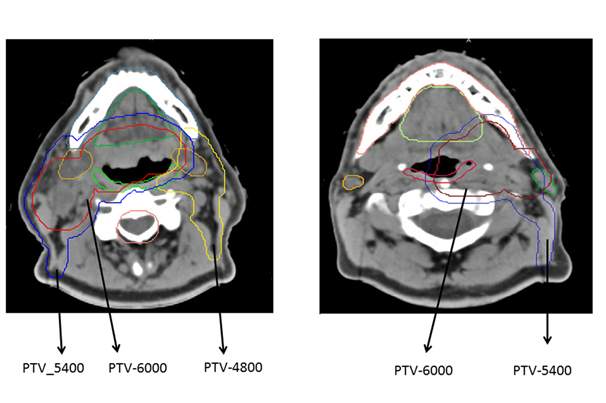Five bench mark patients, who were treated on a previous clinical trial of HPV-associated oropharyngeal cancer patients, RTOG 1016 and who met the more selective inclusion criteria for NRG HN002, were identified for this study. There was diversity among the cases with respect to the primary site within the oropharynx (tonsil or base of tongue), primary tumor stage (T stage), and nodal stage (N stage). The contours of the target volumes and organ at risk were redrawn according to the guidelines of NRG HN002. Figure 1 gives examples of axial views of two CT images included in this study and showing planning target volume (PVT) and organs at risk (OARs).