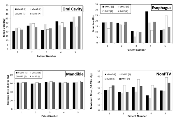 As our major goal during this process was to establish feasibility of the radiotherapy quality measures to be used in NRG HN002, we did not aim to conduct a formal comparison of VMAT with IMRT or Pinnacle with Eclipse plans. These two treatment delivery techniques and these two TPS were selected because they were deemed to be the most likely to be used by the various institutions participating in this national clinical trial. However, there were some variations in the results among the two delivery techniques and two TPS. In general, these variations were not statistically significant.