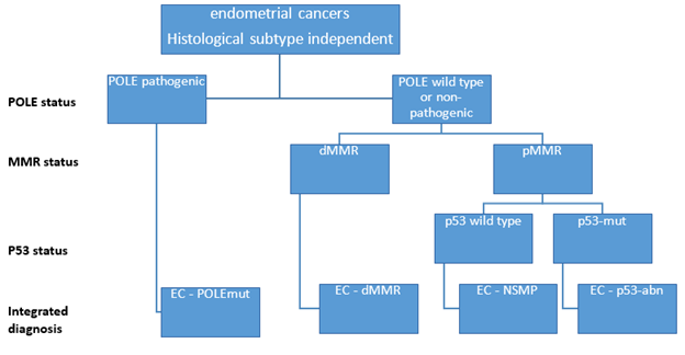 In some cases, about 3–6% have more than one classifying alteration and are referred to as multiple- classifier endometrial cancers. Vermij et al. has established the diagnostic algorithm for the classification of the four molecular sub-groups (Figure 1).15