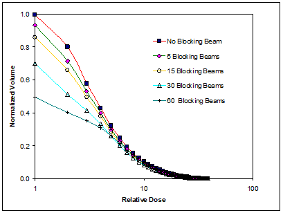 To show the sensitivity of this plugging pattern treatment planning, we analyzed the dose volume histogram of the critical structure. Figure 7 illustrates the DVH curves of a set of treatment plans ranging from no plugging pattern to blocking 60 beams. The DVH shows a non-linear change in the dose sparing effect. The DVH curves are shown in a linear scale (upper figure) and a logarithmic scale (lower figure) to further describe the blocking effect. When even just 5 beams are blocked, the difference between the DVH curves is pronounced. When SRS is used to treat benign tumors (i.e., treating a small target with a high dose), a small increase in the dose to critical structures could possibly generate unexpected complications. A careful selection of a few beams to block can provide better patient care. And since it is usually difficult to distinguish a small percentage of difference in dose distribution by viewing the isodose lines on the treatment planning system, a better quantitative measure is needed for better treatment planning. This kind of accuracy might also be very useful in evaluating blocking patterns in trigeminal neuralgia treatment.23