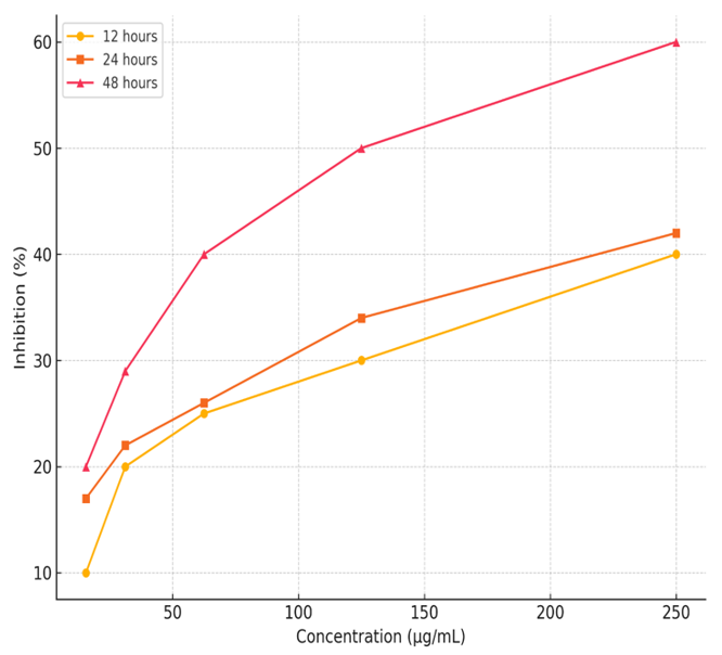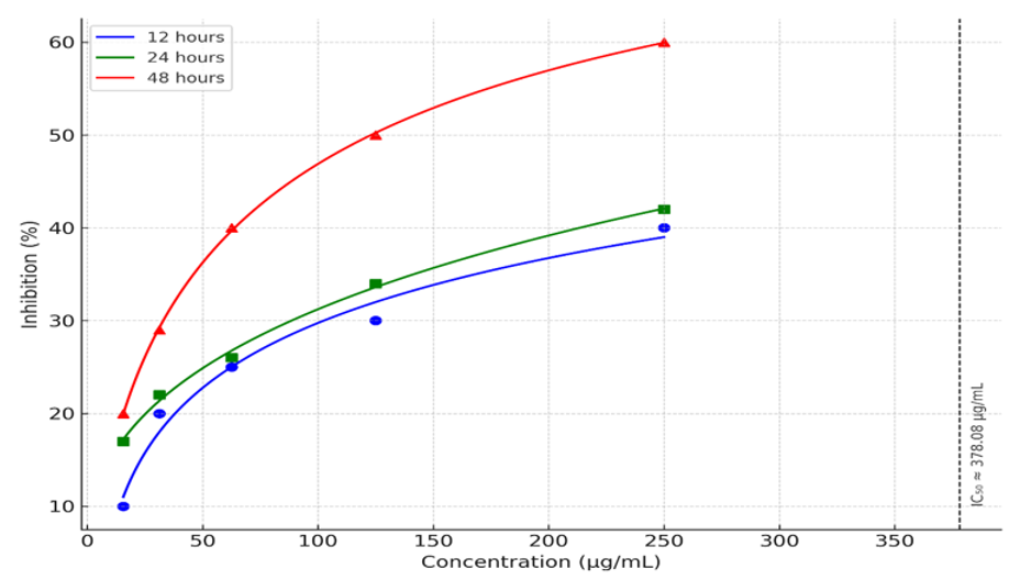 The Figure 1. illustrates the inhibitory effect of the methanolic extract of PPS on the proliferation of A549 cells at various concentrations (15.625 to 250 µg/mL) over three different time periods: 12, 24, and 48 hours. The results show a clear dose-dependent and time-dependent inhibition of A549 cell proliferation. As the concentration of the extract increases, the percentage inhibition also increases across all time points. Additionally, longer exposure times lead to greater inhibition at corresponding concentrations. At the lowest concentration of 15.625 µg/mL, the inhibition is around 10% after 12 hours, approximately 17% after 24 hours, and about 20% after 48 hours. At 31.25 µg/mL, inhibition rises to nearly 20% after 12 hours, 22% after 24 hours, and just under 30% after 48 hours. For 62.5 µg/mL, the inhibition is close to 25% after 12 hours, about 26% after 24 hours, and approximately 40% after 48 hours. At 125 µg/mL, the inhibition reaches around 30% after 12 hours, 34% after 24 hours, and 50% after 48 hours. The highest concentration tested, 250 µg/mL, results in about 40% inhibition after 12 hours, 42% after 24 hours, and close to 60% after 48 hours.