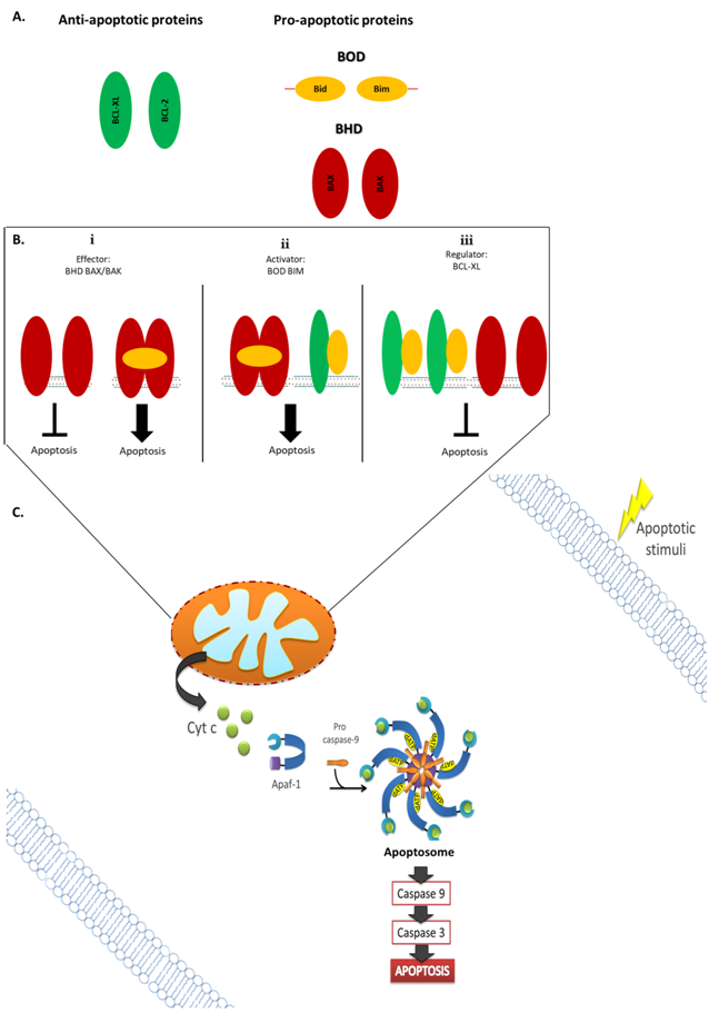 Figure 1 Apoptosis by BH3 domain-only (BOD) proteins in a mitochondrial intrinsic pathway. A. Legend of the anti-apoptotic and pro-apoptotic proteins. B. (i) BOD protein directly binds and activates mitochondrial-localized BAK and BAX, triggering BAK/BAX oligomerization and apoptosis. (ii) BOD promotes apoptosis by binding antiapoptotic BCL-XL protein. (iii) Overexpression of BCL-XL in cancer cells may sequester BOD proteins and thereby block cell death. C. The dephosphorylation of BIM promotes its activation. The BAX/BAK-BIM complex sends the stimuli to permeate the mitochondrial membrane. Cytochrome c is release from the mitochondria activating the caspases and finally killing the cell.