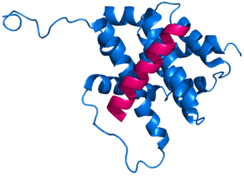 Figure 2 BIM BH3-only domain (showing only conserved α3) (fuchsia) interacting with BAX protein (blue) at α1 and α6. BAX induces cell death when it is activated by the α-helical BH3 domain of BIM. PDB code: 2K7W. Generated using Pymol.
