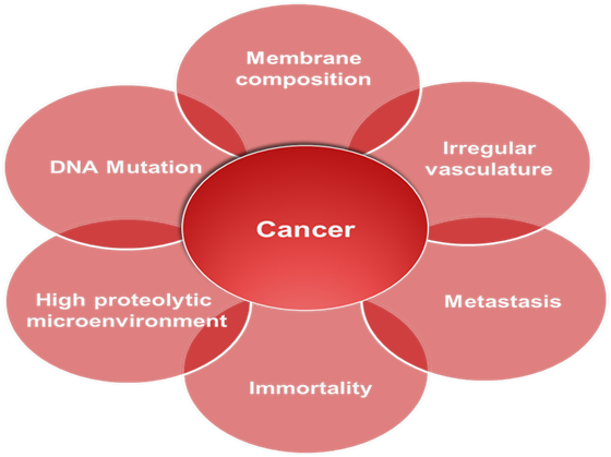 Figure 3 Hallmarks of Cancer. Different hallmarks are necessary for cancer progression. These hallmarks are characterized by changes in the nuclei eg, DNA damage; on the cell surface eg, the membrane composition, and its microenvironment due to the irregular vasculature, high protease concentration and finally the metastatic spread.