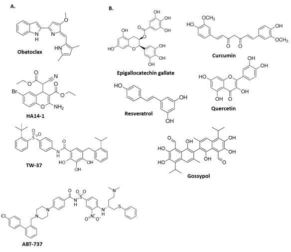 Figure 4 Chemical structures of some A. synthetic and B. natural small-molecule inhibitors of survival proteins BCL-2 and BCL-XL promoting initiation of apoptosis.