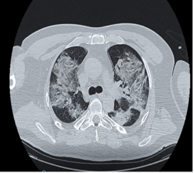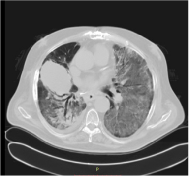 Figure 2 Chest CT scan of Co-19 pneumonia case showing the initial evolution into a bilateral whited out lung.