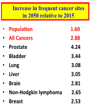 The magnitude of the cancer problem remained unknown until very recently when Egypt national cancer registry program published its results in 2014, after 10years of population-based registration.1 The published incidence data replaced the hospital-based proportions that wouldn’t help to estimate magnitude of the problem.2 The estimated crude incidence of cancer for 2013 was 115.7/100,000 males and 11o.3/100,000 females. The estimated incident cases were 114,985 in 2013. Assuming that the age specific incidence rates would not change up to 2050; the number of incident cases would increase to 341,169 due to population growth by 160% and aging of the population as shown in the corresponding population pyramids. The main cause of increase was attributed to demographic change rather than population growth. This 3-fold increase varied by site of tumor as shown in the table above. For the most common sites, increase in prostate cancer was highest for prostate cancer (424%) and lowest for breast cancer (253%). This expected increase by site would be reflected on control activities for early detection of breast and other cancers. Control of HCV infection would affect liver cancer.3 Plans of control of HCV aim at eradication of the infection that would start to be effective by 2018. Interestingly, childhood cancer would increase to 120%; giving chance for proper planning for equity of distribution of services that are currently mainly located in Cairo (Figures 1-7).