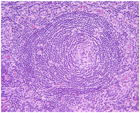 The pathology of hyaline vascular castleman's disease is characterized by lymphoid proliferation with depletion of the germinal center and expansion of the mantle zones. Small lymphocytes are arranged concentrically giving "onion-skin" appearance.6 The pathology of plasma cell type is characterized by preservation of the nodal architecture with follicular hyperplasia. Intermolecular area shows abundance of plasma cells.7 Plasma cells are usually polyclonal but may be monoclonal if it's associated with POEMS syndrome [8]. Human herpes virus 8 (HHV-8) associated Castleman's disease is associated with immunodeficiency. Pathologically: the involved lymph nodes are characterized by large number of immunoblasts (or plasmablasts) in the outer mantle zone of some follicles. Immunoblasts are polyclonal with weak expression of CD20 [9]. We report 2 cases of Lymphadenopathy that was diagnosed finally as castleman’s disease. The first is of generalized Lymphadenopathy with constitutional manifestation diagnosed finally as castleman’s disease. Patient received combination chemotherapy with long survival. The second case is of recurrent localized Lymphadenopathy diagnosed as castleman’s disease with unusual very young age presentation. Surgical removal of the mass was done with long survival.