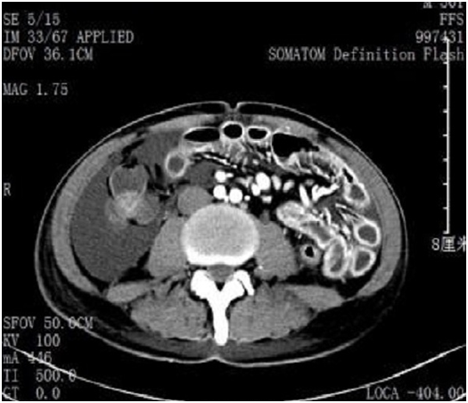 A 56 years old male patient was admitted by Peking University Shenzhen Hospital with a chief complaint of upper abdominal pain and distension after meals for 4 months. The patient was diagnosed as gastric antrum adenocarcinoma by endoscopic biopsy and received an operation of open distal gastrectomy (Billroth I reconstuction)+D2 lymph node dissection. The post operative pathological analysis revealed a gastric moderately and poor–differentiated adenocarcinoma with lymphnode infiltration (pT2N2M0). About 3 weeks after surgery, the patient received chemotherapy of S–1 alone strategy. The dosage of medication was 60mg bid (twice per day) Day1–28 every 6 weeks for 6 cycles (BSA=1.64㎡). On the 21st day of first cycle, the patient suffered from a continuous left upper abdominal colic pain and severe diarrhea and readmitted by our hospital. His excrement was a non–bloody, dark yellow, watery content approximately 3– times per day. Physical examination revealed tenderness and rebound tenderness at left upper abdomen. The bowel sound was hypereactive, 12 times per minute.