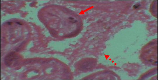 Figure 2 Histological image of category 1 showing Maternal RBCs parasitized in the EIV (solid arrow) and a Syncytiotrophoblast cell (dotted arrow). ET: x 40.