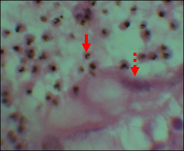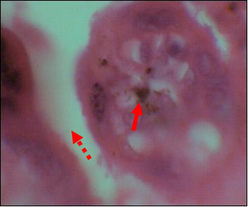 Figure 3 Microscopic picture of category 3 showing clumps of malarial pigment (hemozoin) in the villous stroma (solid arrow) and empty RBC EIVs (dotted arrow) HE : x100.