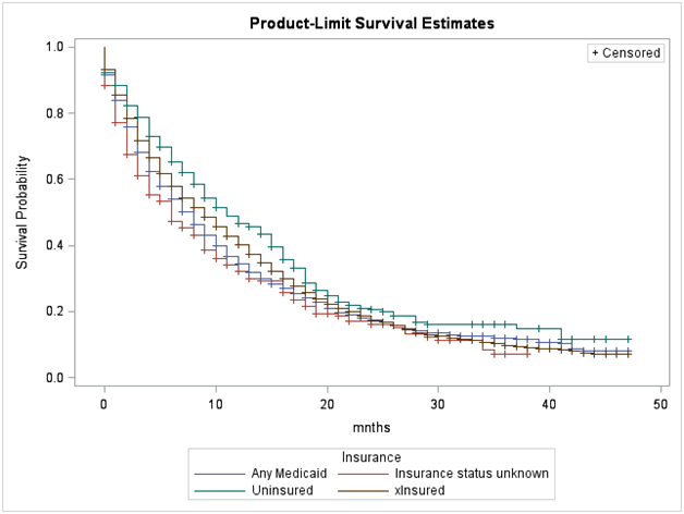 Figure 2 Adjusted Survival Curves for Glioblastoma Cases by Insurance from the SEER Data, 2010-2013.