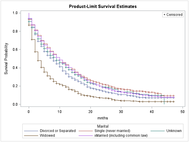 Figure 3 Adjusted Survival Curves for Glioblastoma Cases by Marital Status from the SEER Data, 2010-2013.
