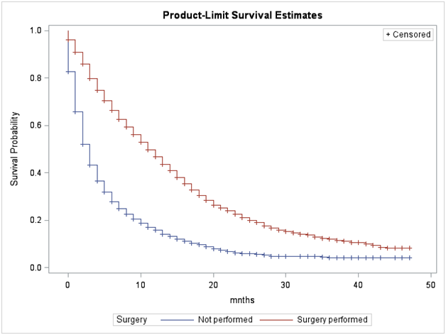 Figure 4 Adjusted Survival Curves for Glioblastoma Cases by Surgery Status from the SEER Data, 2010-2013.