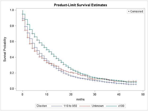 Figure 8 Adjusted Survival Curves for Glioblastoma Cases by Percent with Less than High School Education in County of Residence from the SEER Data, 2010-2013.
