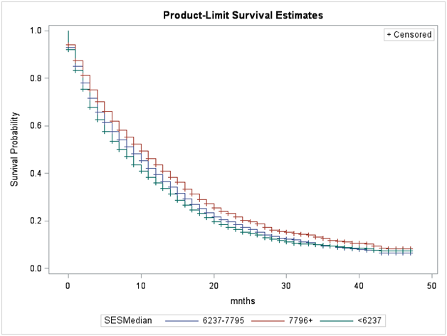 Figure 9 Adjusted Survival Curves for Glioblastoma Cases by Median Family Income in County of Residence from the SEER Data, 2010-2013.