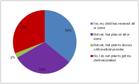 Of those parents who recalled receiving specific vaccine recommendations at their child’s dental visit (n=42) over two-thirds (67%) reported that their child had received all or some of the recommended vaccines since the visit or that they were planning to obtain the vaccines. Of the 31% who did not plan to follow up, comfort with receiving a vaccine recommendation from the dental team was evenly distributed, with 38% indicating they were very to somewhat comfortable, 24% indicating they were neutral, and 38% indicating they were very or somewhat uncomfortable with dental providers making vaccination recommendations (data not shown).