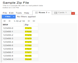 At MD Anderson’s outpatient cancer center in Sugar Land, Texas, we sought to evaluate the utility of obtaining consent during a separate clinic appointment the day prior to chemotherapy infusions. However, there was some apprehension regarding the length of travel that many patients would have to undertake in order to visit our clinic on two separate days. We sought to use geo-coding techniques to qualify where our patients lived in relationship to our center, but were frustrated by the cost and complexity of existing options, especially at a center without statistics or information analysis support. Here, we describe a technique of using easy, readily available, and free online tools (Google Fusion Tables) to generate data that is accessible to any community clinic with limited resources.
