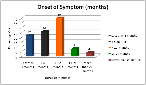 Onset of symptom: Only 11(22%) respondents presented to the hospital within three months of onset of the symptoms. A greater number, 39(78%) presented three months or more later and 10 % after twenty four months.