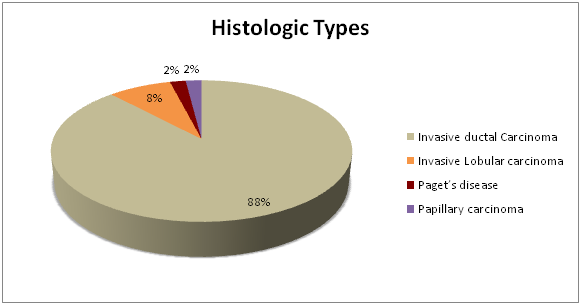 Histological type of tumour: Invasive ductal carcinoma was the most common type of tumour (88%) seen in the women. Four women (8%) presented with invasive lobular carcinoma whiles one (2%) each of the women had Pagets disease and papillary carcinoma respectively.