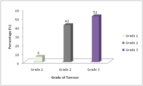 Grade of tumour: Only 3(6%) respondents had grade 1 disease. Twenty one (42%) had grade 2 disease and 26(52%) had grade 3.