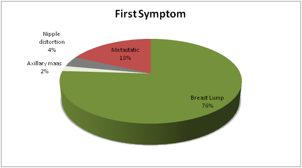 First symptom noticed: Breast lump was the commonest symptom noticed, representing 76% of cases. Eighteen (18%) presented with symptoms of distant metastasis.