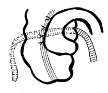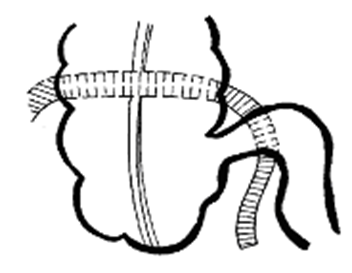 Figure 1 Diagram of the operation to create an ileocecal obturator with prosthetics of the sphincters Varoliy and Buzi with a strip of the vascular prosthesis.