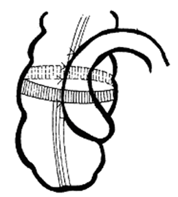 The strip of the vascular prosthesis is passed behind the ascending intestine 1-1.5cm proximal to the ileocecal fistula and through the mesentery of the terminal ileum also 1-1.5cm proximal to the ileocecal fistula (Figure 3);