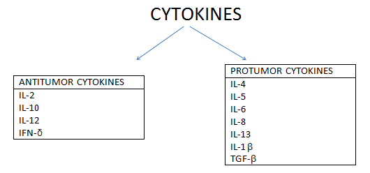 Cytokines are molecular messengers produced by immune cells and cancer cells. Some cytokines such as IL-2, IL-10, IL-12 and IFN-γ acts as anti-inflammatory and anti-tumor activity where as some cytokines acts as proinflammatory and protumorigenic such as IL-6, TGF-β, IL-17, IL-23, IL-8, IL-5, IL-4, IL-13 involved in tumor progression by angiogenesis, cell proliferation, cell survival, immunomodulation, tissue damage by activation of NF-KB, STAT-3 key transcription factors. We have to understand the anti-inflammatory and anti-tumor activity or pro-inflammatory and pro-tumor activity depends on tumor microenvironment. Role of cytokines in different stages of cancer and its progression helpful for biomarkers for early detection, prognostic markers, therapeutic target cancer immunotherapy.