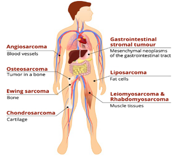 Sarcomas are cancers of the bones and soft tissues.1,2 They are generally divided into soft tissue sarcomas and bone sarcomas based on their different mesenchymal origins and anatomical locations. They develop from cells that maintain the structure or cushion other organs in our bodies, including bone, cartilage, muscle, fat, and tendons. The different types of sarcomas are: a) Primary bone sarcomas, including Chondrosarcoma, Ewing Sarcoma, and Osteosarcoma. The various soft tissue sarcomas are: Angiosarcoma, Gastrointestinal Stromal Tumors (GIST), Kaposi Sarcoma, Leiomyosarcoma, Liposarcoma, Synovial Sarcoma, Undifferentiated Pleomorphic Sarcoma, Desmoid Fibromatosis and Pigmented Villonodular Synovitis.2 They are uncommon and make up only 1 percent of all adult cancers.1 However, in children and young adults of up to 30years age, its occurrence is higher; up to 3/100,000 happen and especially Ewing Sarcoma is experienced by teens. Since sarcomas are transported by blood, their spread is quicker and often secondaries are possible, compared to other cancers, such as carcinomas. About 80 percent of sarcomas begin in the body's soft tissues (cartilage, muscle, fat, and tendons). The other 20 percent arise in the bones. Medical news today1 indicates that 60% of sarcoma starts in an arm or leg, 30% in abdomen or torso and 10% in neck or head. The greatest numbers of bone tumors are metastatic and spread to lung, colon, or breast. Figure 1 shows different types of sarcomas including angiosarcoma, osteosarcoma, Ewing sarcoma, Chondrosarcoma, etc.3