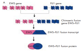 Sarcomas can be subdivided into two distinct classes, depending upon the genetic mutations. One class includes tumors having complex karyotypic abnormalities without a particular pattern and other class includes Ewing sarcoma comprises tumors with unique chromosomal translocations leading to specific fusion genes.11 Increasingly, Ewing family of tumors are being characterized by t(11;22)(q24;q12) chromosomal translocation , this generated fusion of 50 segment of the EWS gene with the 30 segment of the ETS family gene FLI-1. This resultant EWS-FLI-1 fusion protein acts as an aberrant transcriptional activator as shown in Figure 4, which contributes to the development of ESFT by altering the expression of its target genes in a better cellular environment.12 Table 1 shows the EWS fusion types in Ewings and other sarcomas.