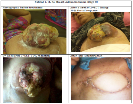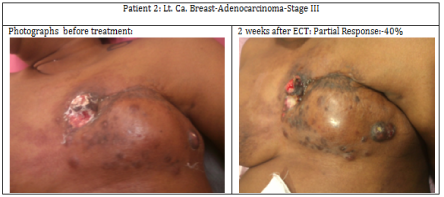 Patient 1: Tumor decreased in size, pain score lessen from 10 to 4 after first sitting. Bleeding and oozing had completely stopped. The tumor had reduced to 50% after 3rd sitting (Figure 1). Patient tolerated the treatment well with no residual effects from the electric pulses. Patient had no visceral mets elsewhere with evidence of PET CT scans after 6 months. Patient underwent Flap reconstruction after 3 sittings of ECT from palliative to curative intent. Patient is doing well from ECT, now after one year of the treatment.