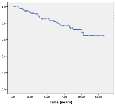 Median follow up from the treatment end was 5.5 (range, 3–8) years. Median OS was 56.8 months. OS rates at 2 and 5 years were 78% and 65%, respectively. Comorbidities and advanced age were the major factors contributing to death.