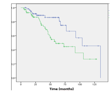 Figure 2 Kaplan - Meyer local relapse free survival (LRFS) between scalp (blue) vs no scalp (green) lesions.