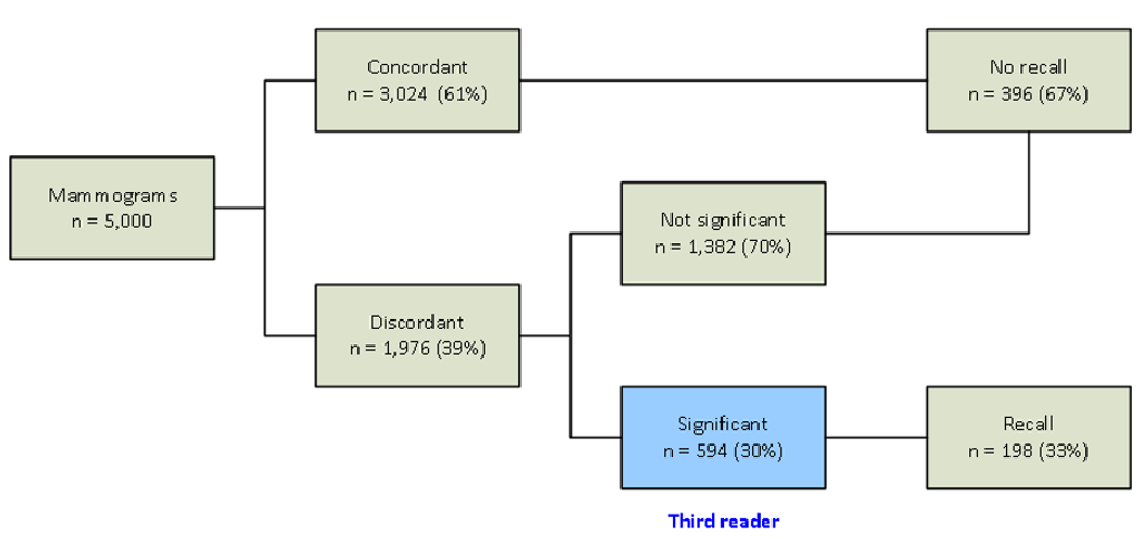 The morphological variables analyzed were: mammographic density (adipose tissue, predominantly adipose tissue, predominantly dense or dense), regular nodule, irregular nodule, microcalcifications, architectural distortion, focal asymmetry. Cases were divided into Concordant and Discordant. Discordant cases were subdivided in significant and not-significant discrepancies. Arbitration for a third reader was performed on cases of significant discrepancies. After the third evaluation, women were recalled or not recalled, depending on the final judgment released by the third reader.