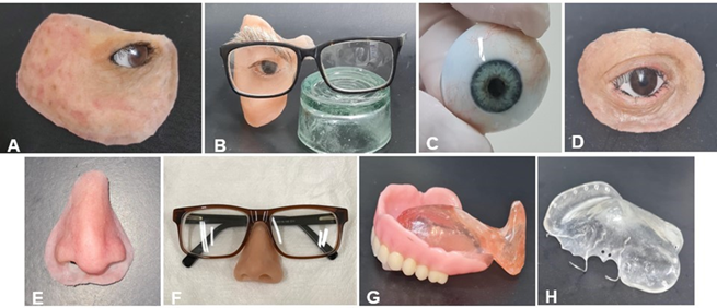 Figure 1 INCA dentistry sector MFPs, from august 2015 to august 2020. A- Silicone facial prosthesis, B- Acrylic resin facial prosthesis, fixed to glasses, C- Eye prosthesis, D- Oculo-palpebral prosthesis, E- Silicone nasal prosthesis, F- Acrylic resin nasal prosthesis, fixed to glasses, G- Obturator prosthesis, E- Surgical plate.