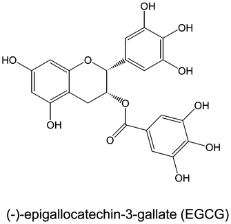 The purified green tea polyphenols (GrTP) contain >95% polyphenols when analyzed with high-performance liquid chromatography (HPLC). Pure GrTP extracts contain the following percentage composition of polyphenols (each catechin): (−)-epicatechin (EC) 35%, (−)-epigallocatechin (EGC) 15%, (−)-epicatechin-gallate (ECG) 4%, and (−)-epigallocatechin-3-gallate (EGCG) 38–40%. Among these components, EGCG is the most abundant tea polyphenol. The molecular structure of EGCG, are presented in the Figure 1.