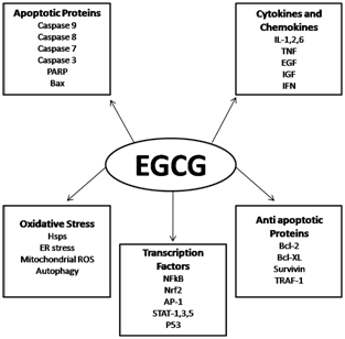 An expanding body of preclinical evidence suggests EGCG, has the potential to impact a variety of human diseases. Much of the cancer chemopreventive properties of green tea are mediated by EGCG that induces apoptosis and promotes cell growth arrest by altering the expression of cell cycle regulatory proteins, activating killer caspases, and suppressing oncogenic transcription factors and pluripotency maintain factors. Various clinical studies have revealed that treatment by EGCG inhibits tumor incidence and multiplicity in different organ sites such as liver, stomach, skin, lung, mammary gland and colon. In this review, we discuss its cancer preventive properties and it’s mechanism of action at numerous points regulating cancer cell growth, survival, angiogenesis and metastasis.